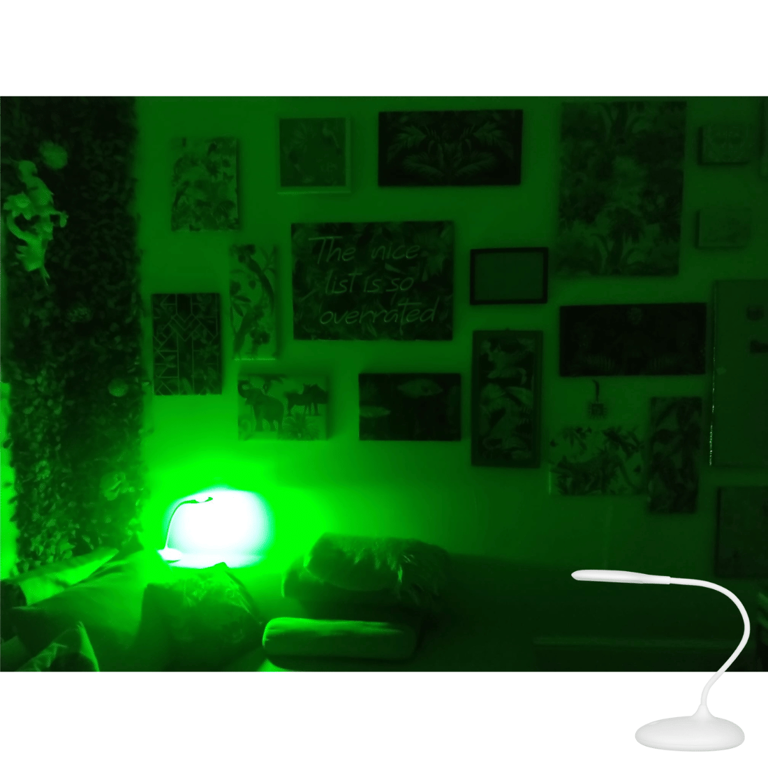 CALM 520nm GREEN Lighting LAMP BEST FOR HEADACHES AND MIGRAINES SHOWS LAMP ON CORNER OF SOFA GOOSENECK LAMP TURNED ON RECHARGEABLE BATTERY POWERED LAMP