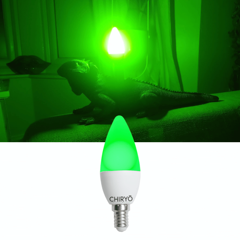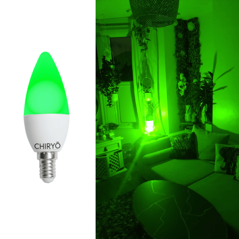 CHIRYŌ Light Therapy Calm Green Light Candle Bulb (E14) for Headaches and Migraines emits a precise, scientifically-studied narrowband 520 nm wavelength, widely reported as better tolerated by migraine sufferers.